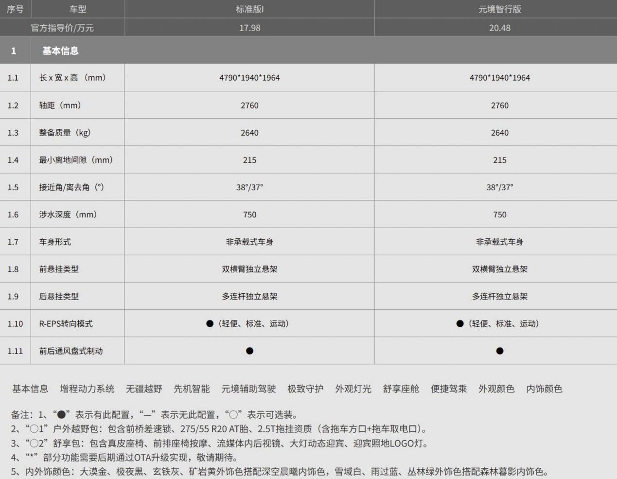 车身尺寸数据凸显其实用性:长宽高分别为4790/1940/1964毫米,轴距达2760毫米。相比燃油版车型,车身高度有所提升,配合215毫米最小离地间隙、38度接近角、37度离去角以及750毫米最大涉水深度,展现出较强的通过能力。车辆具备2.5吨拖挂资质,进一步拓展了使用场景。