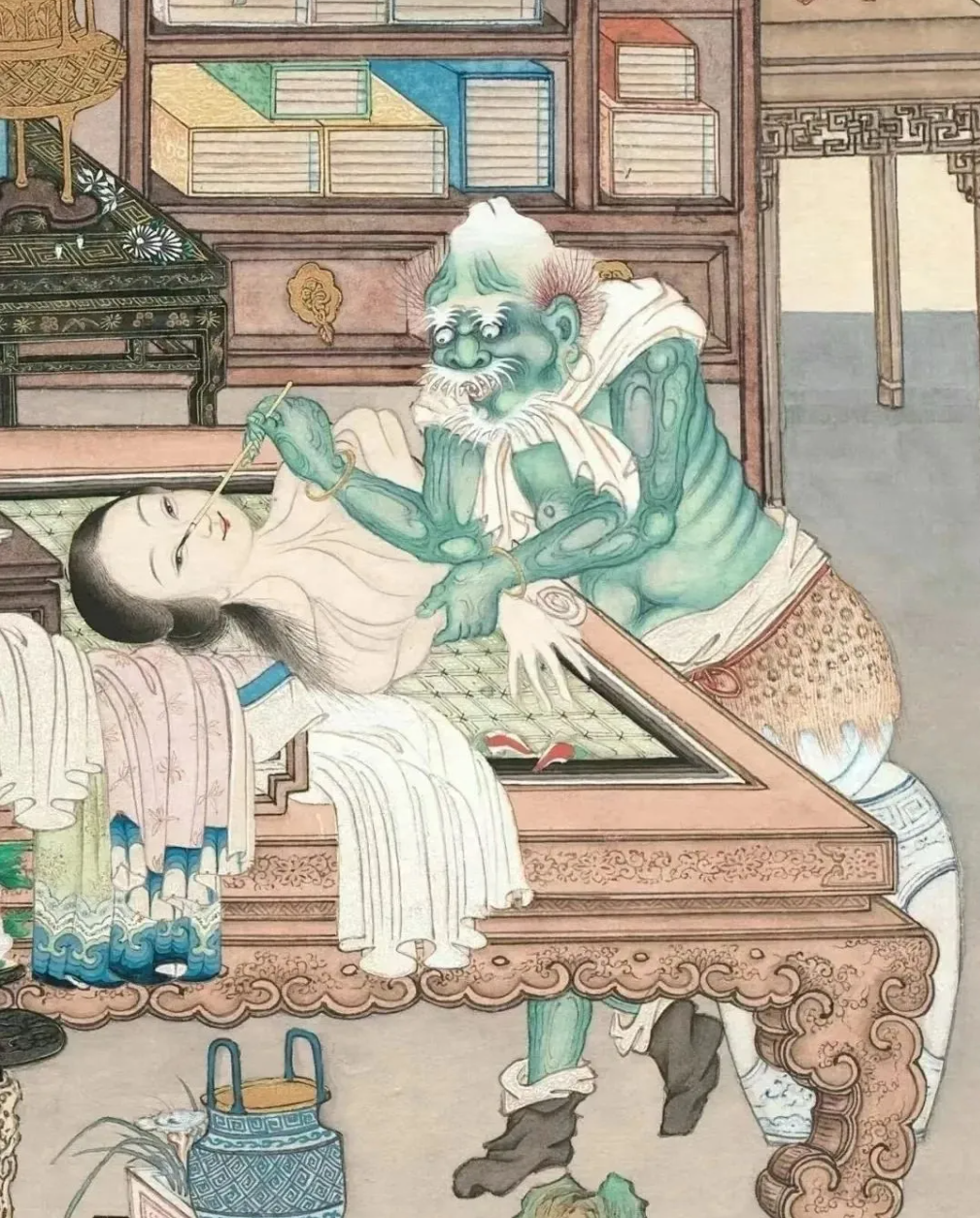 画作采用西方透视法构建空间,书房的桌椅、书架、瓷器等细节以工笔勾勒,光影明暗层次分明,营造出逼真的立体感。然而,在鬼怪形象的刻画上,画师却回归传统水墨的写意笔法:青面獠牙的恶鬼身披豹纹短裙,手持彩笔描画人皮,其面部狰狞与身体扭曲的动态,通过墨色浓淡的快速切换呈现,形成强烈的视觉反差。更精妙的是,画中“人皮”并非简单敷色,而是以超写实手法描绘肌肤纹理,甚至能看见褶皱处的阴影,与恶鬼的粗粝笔触形成鲜明对比,暗喻“美丽皮囊下的恐怖真相”。
